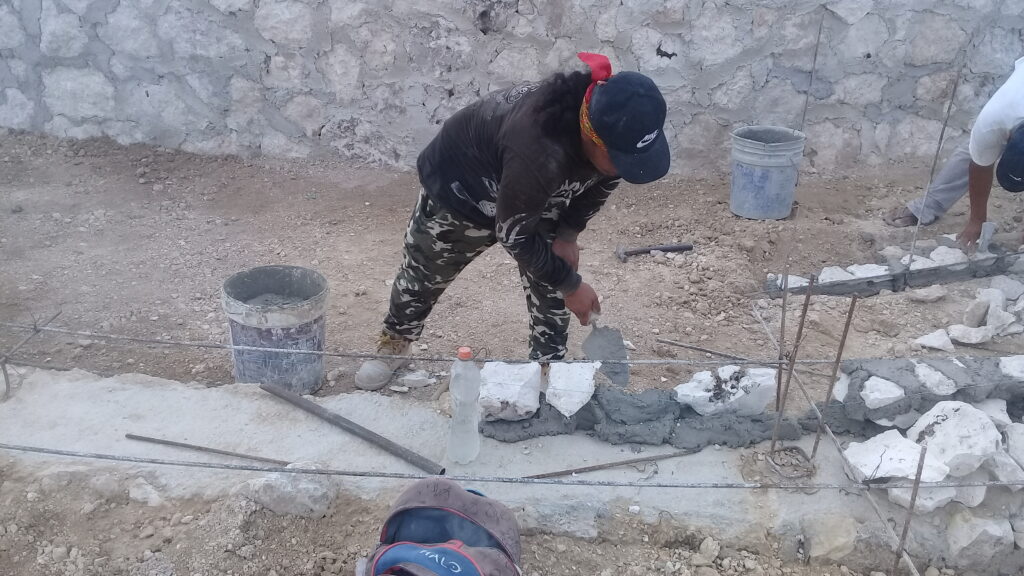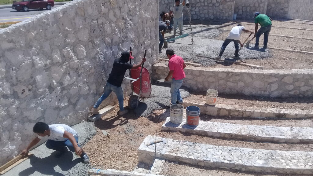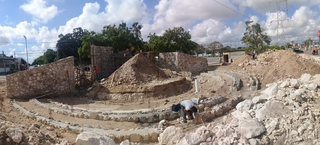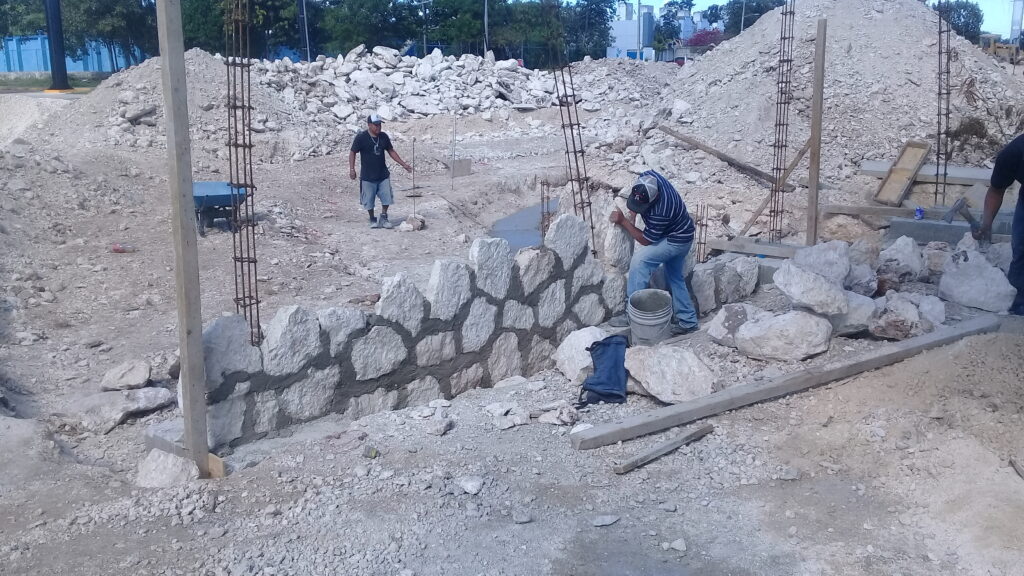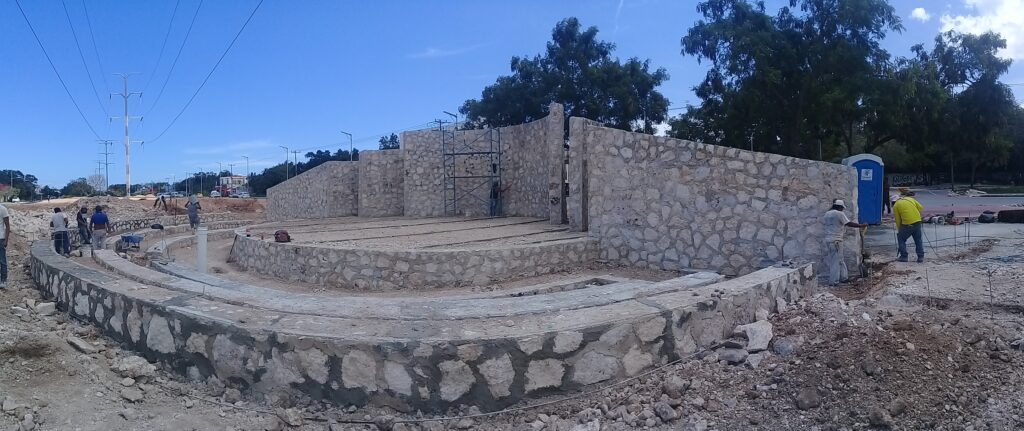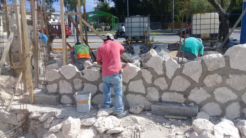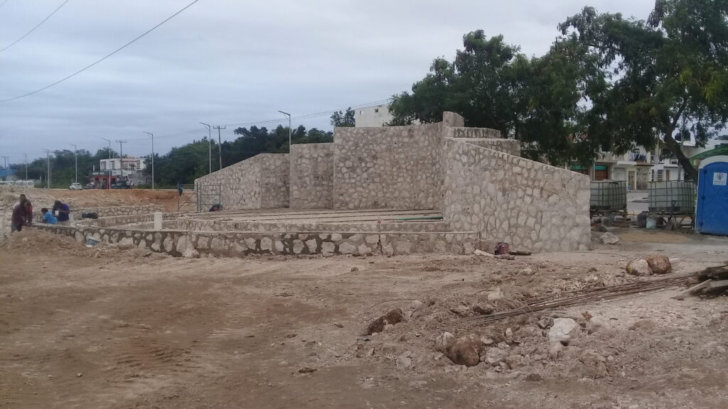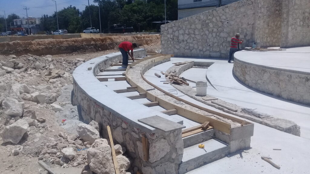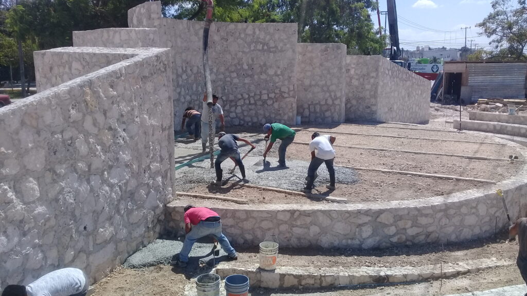 La estructura se compuso principalmente de muros y gradas construidos con mampostería de piedra de la región vista maya, lo que permitió integrar el diseño con el entorno natural y reforzar la identidad local del espacio. Las labores de albañilería fueron clave en la conformación de los niveles, accesos y circulaciones, cuidando tanto la funcionalidad como la estética del conjunto.