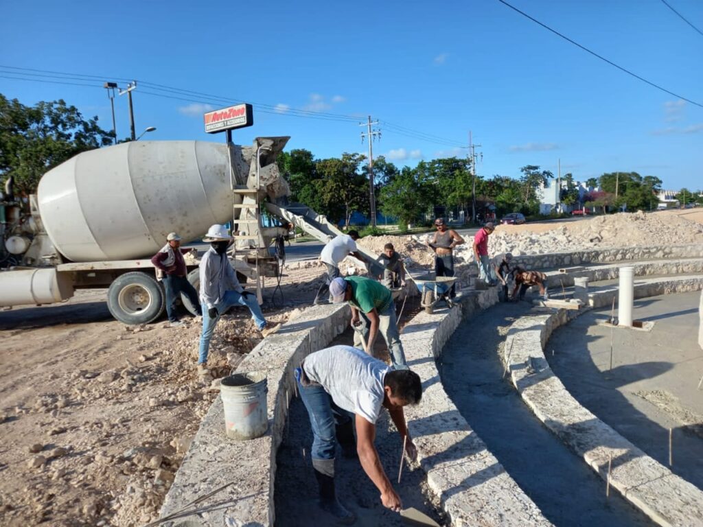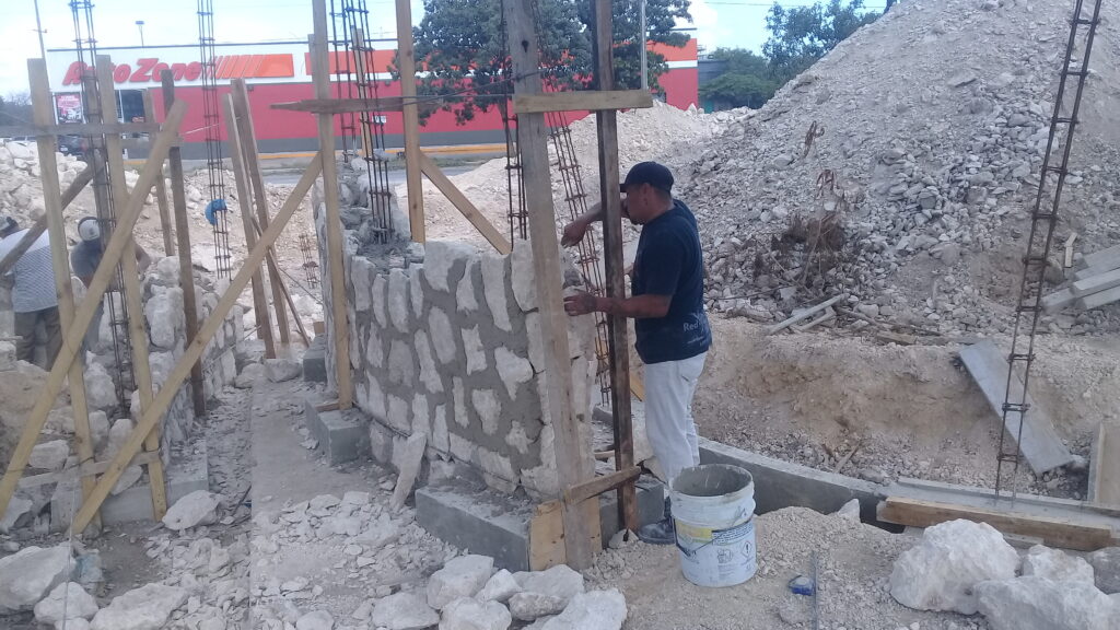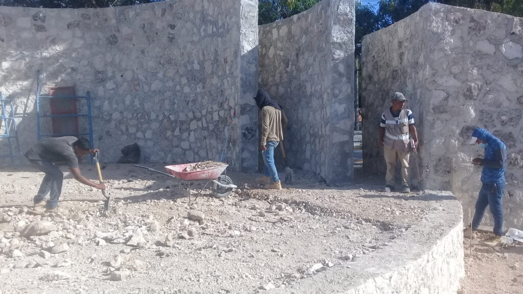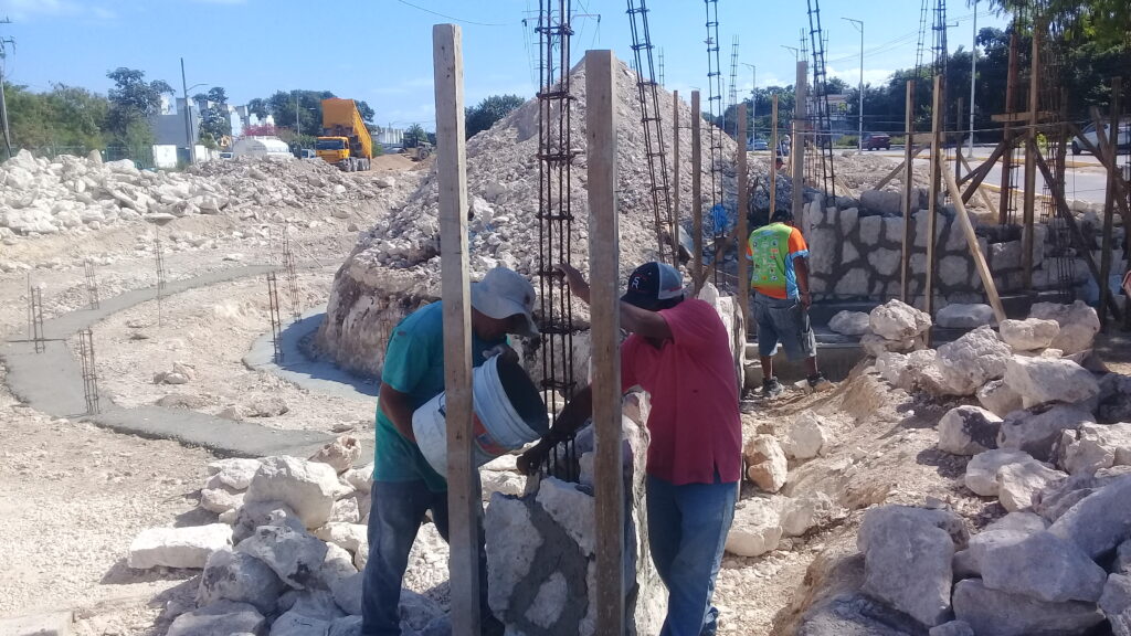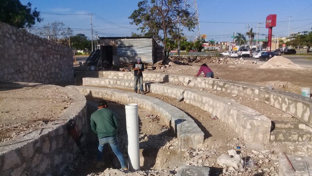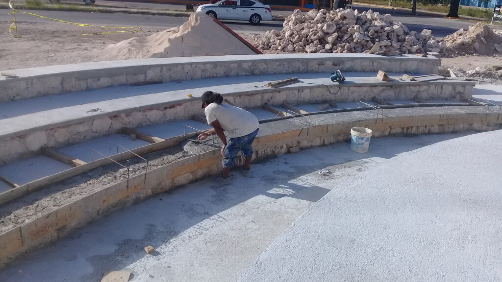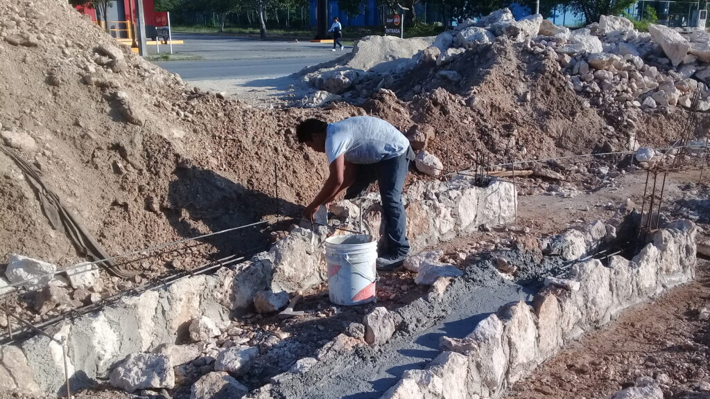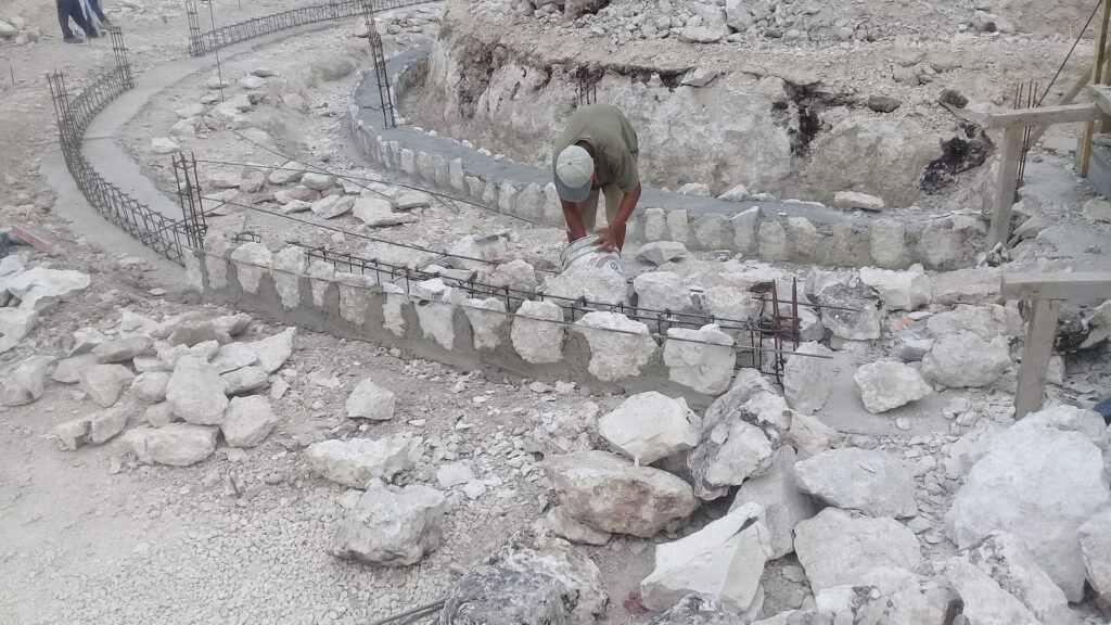 La estructura se compuso principalmente de muros y gradas construidos con mampostería de piedra de la región vista maya, lo que permitió integrar el diseño con el entorno natural y reforzar la identidad local del espacio. Las labores de albañilería fueron clave en la conformación de los niveles, accesos y circulaciones, cuidando tanto la funcionalidad como la estética del conjunto.