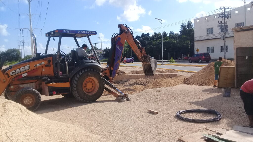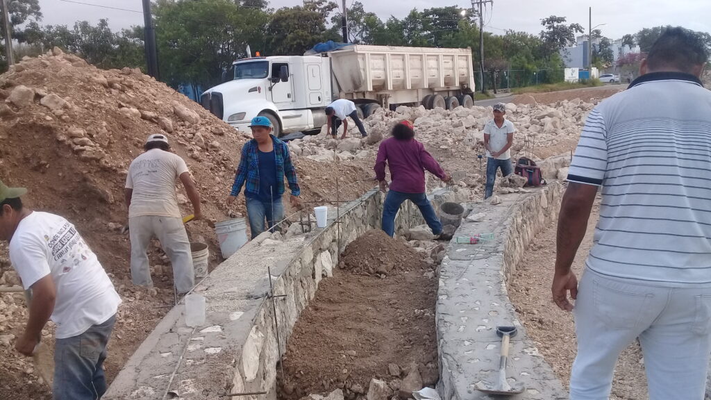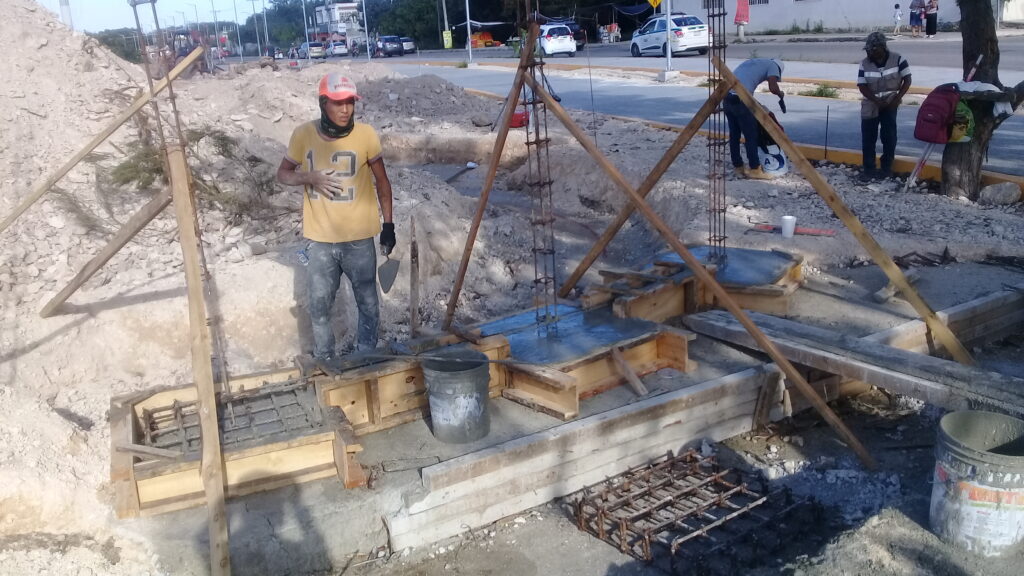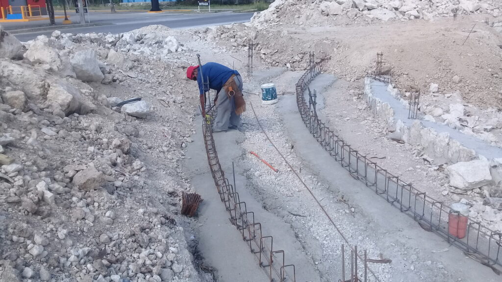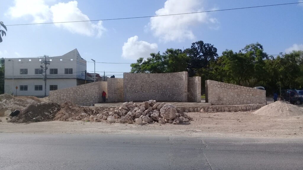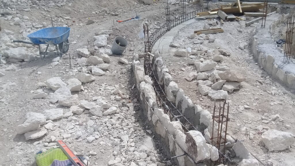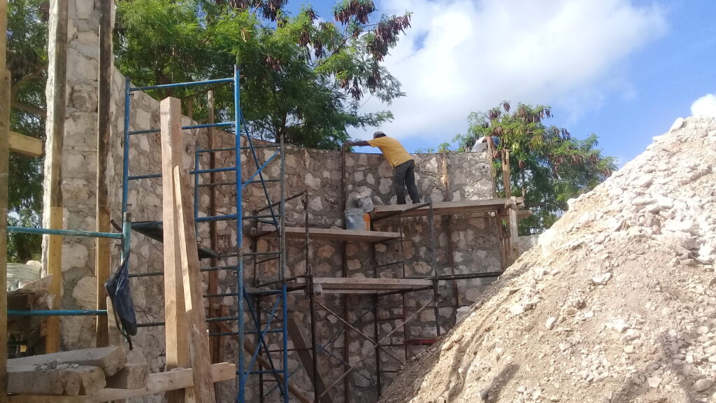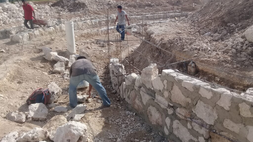 La estructura se compuso principalmente de muros y gradas construidos con mampostería de piedra de la región vista maya, lo que permitió integrar el diseño con el entorno natural y reforzar la identidad local del espacio. Las labores de albañilería fueron clave en la conformación de los niveles, accesos y circulaciones, cuidando tanto la funcionalidad como la estética del conjunto.
