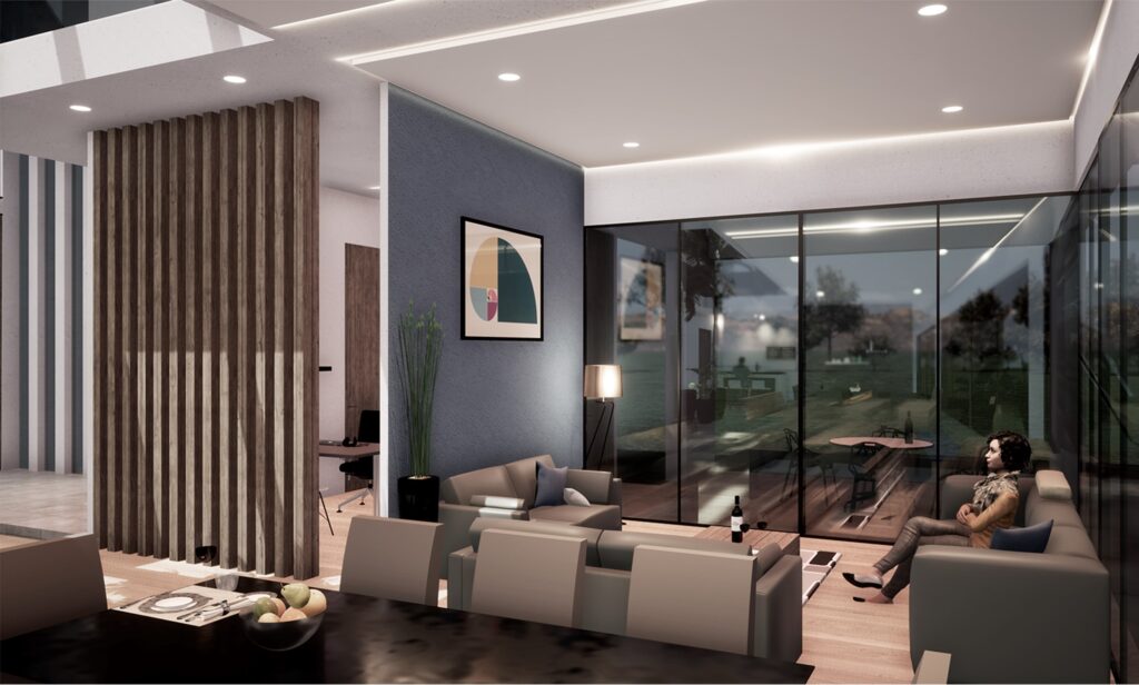 La planta baja, un espacio de convivencia y encuentro, alberga una cochera para dos vehículos, un recibidor que da paso a una sala y comedor inundados de luz natural, una cocina de diseño, un bar, una terraza que invita al relax, y áreas de servicio discretamente ubicadas. Un jardín central, eje vertebrador de la planta, responde al anhelo del cliente por integrar la vegetación en el día a día, creando un oasis interior. Un garage para bicicletas y un estudio con baño completo complementan este nivel, ofreciendo espacios para el trabajo y el ocio