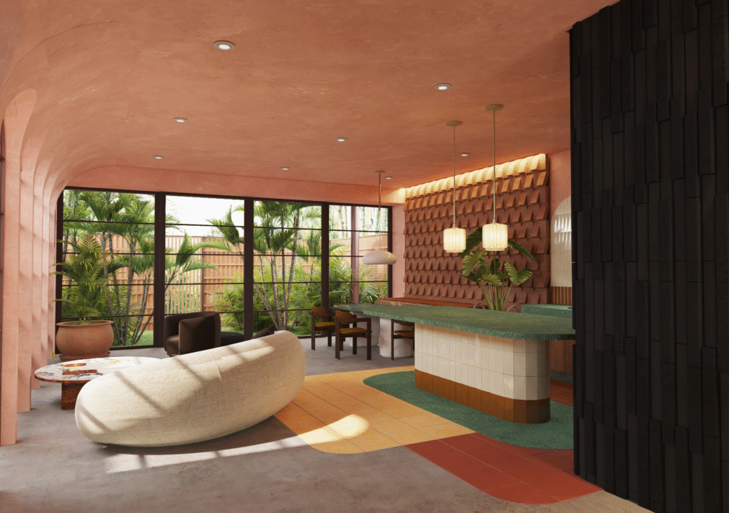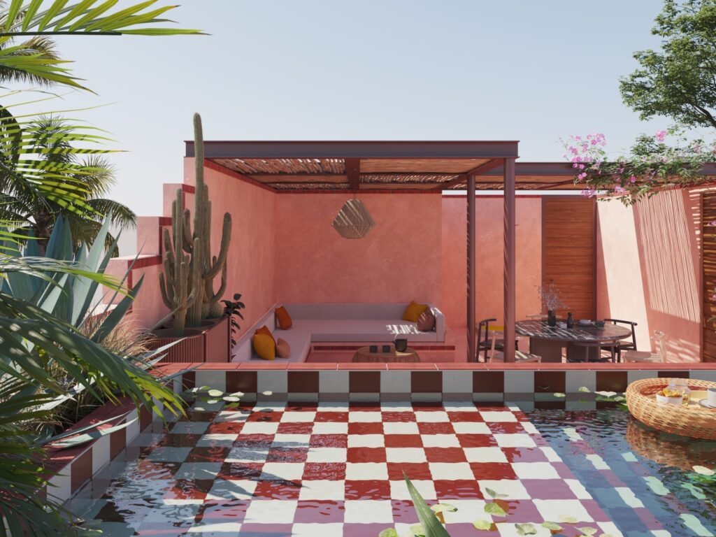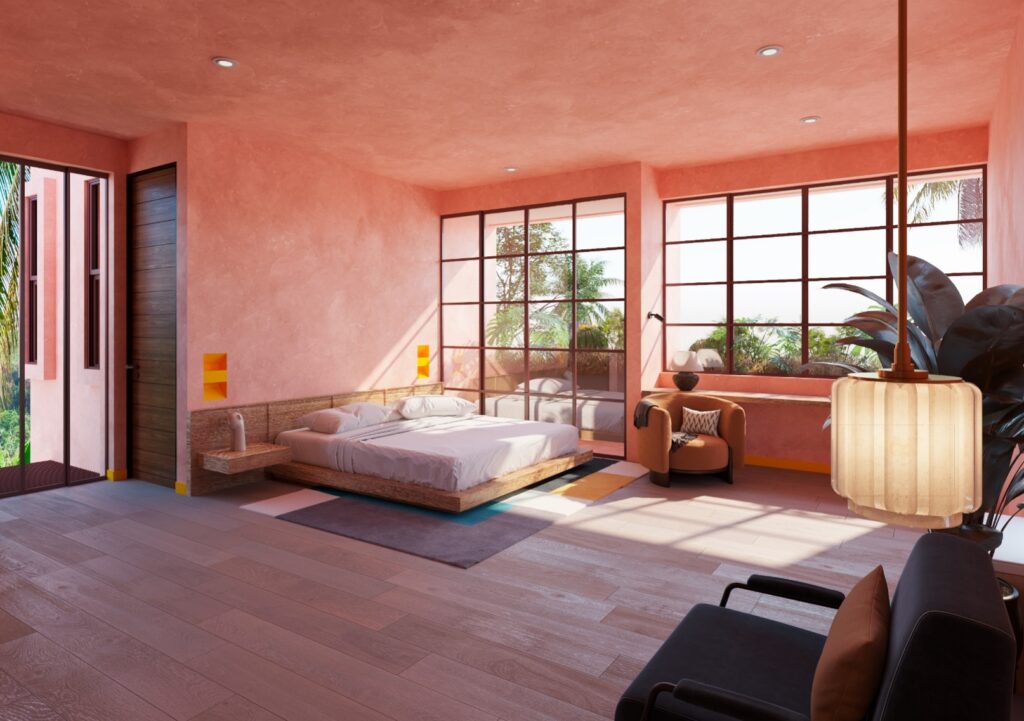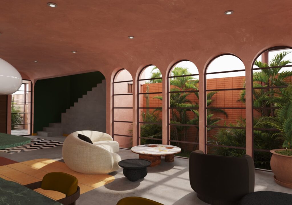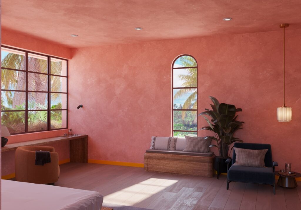 Los muros interiores y exteriores están acabados en chukum rosa, creando una atmósfera cálida, terrosa y envolvente. Este acabado natural no solo aporta textura y profundidad, sino que refuerza el carácter orgánico del proyecto.