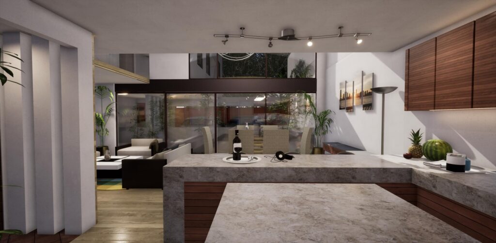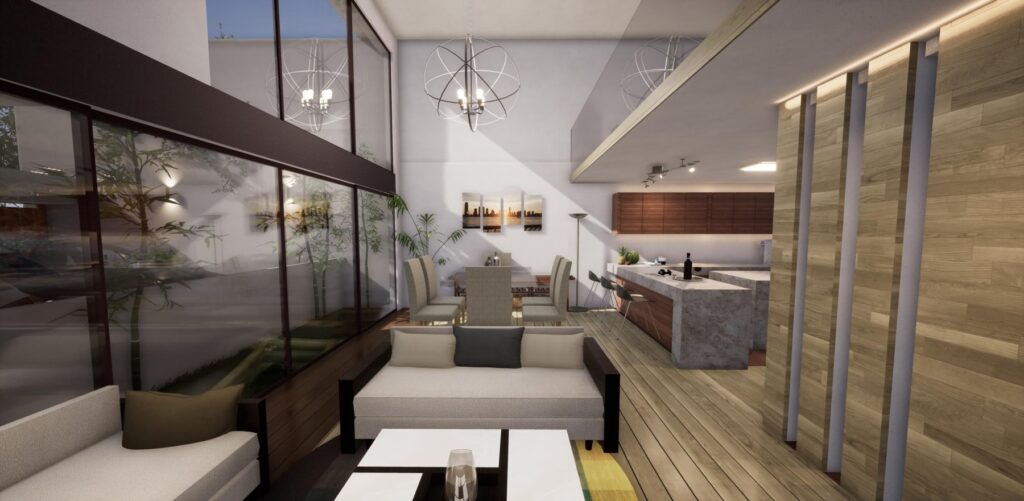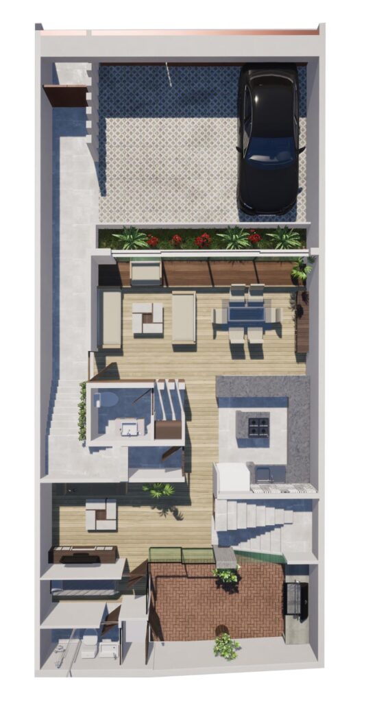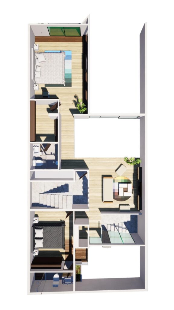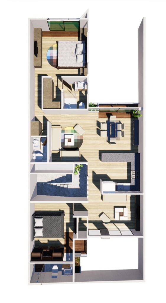 El primer departamento, un dúplex de 218 m², se despliega en planta baja y primer nivel. La doble altura de la sala y el comedor crea un ambiente de amplitud y luminosidad. La cocina, la alacena, el family room, el patio con asador y el cuarto de servicio, se integran armoniosamente en la planta baja. En el primer nivel, dos recámaras con baño y vestidor, y balcones privados, ofrecen espacios íntimos y confortables.