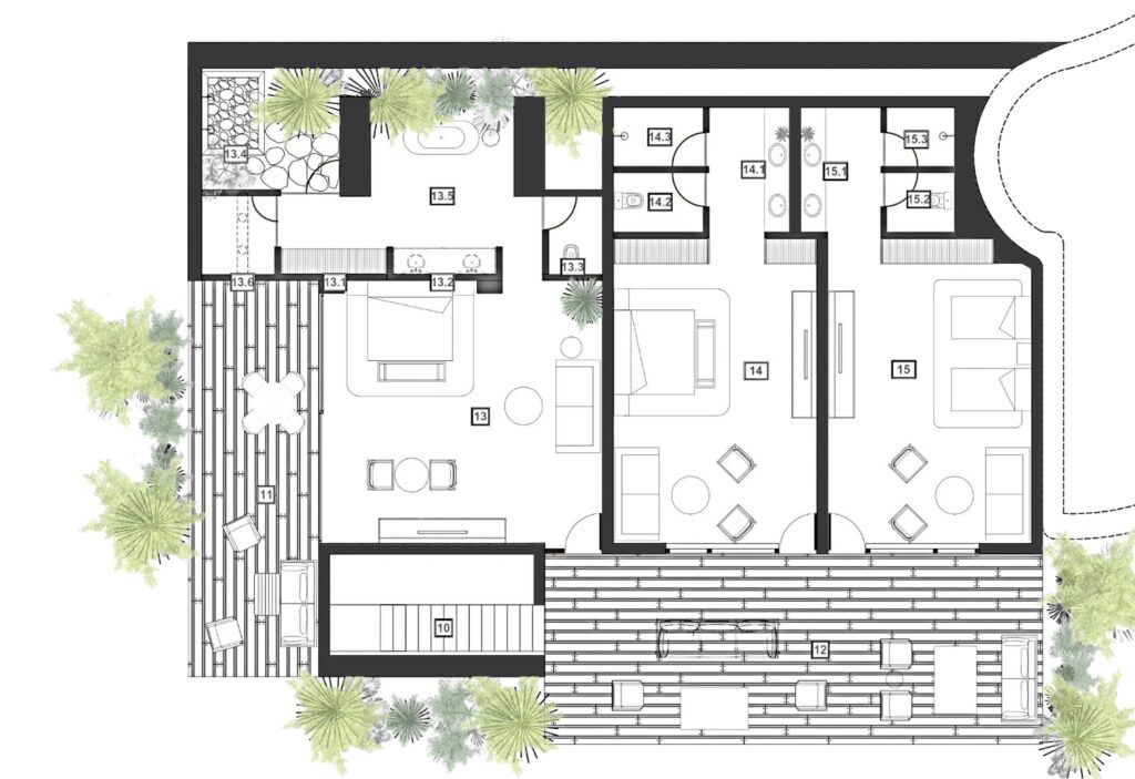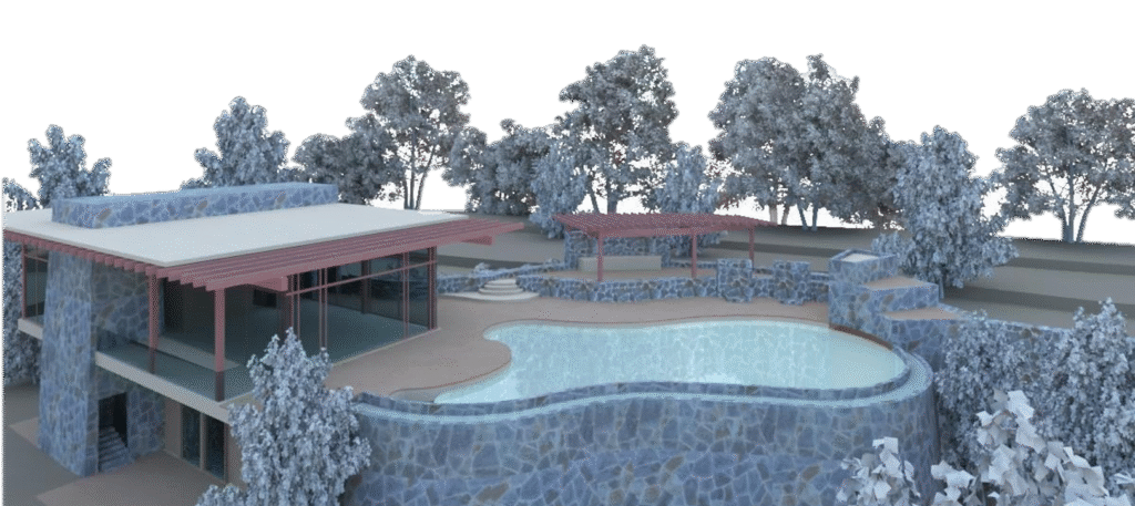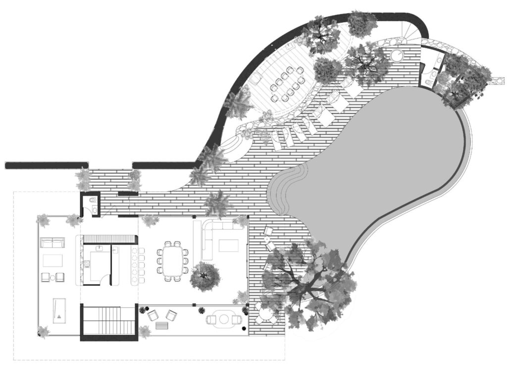 La planta arquitectónica presenta un espacio que combina áreas interiores habitacionales con un entorno exterior diseñado para el esparcimiento. El elemento principal es una alberca de forma orgánica ubicada en el extremo derecho, rodeada por una amplia plataforma tipo deck que conecta distintas zonas del conjunto. Este espacio está delimitado por vegetación, lo que contribuye a una integración con el entorno natural.