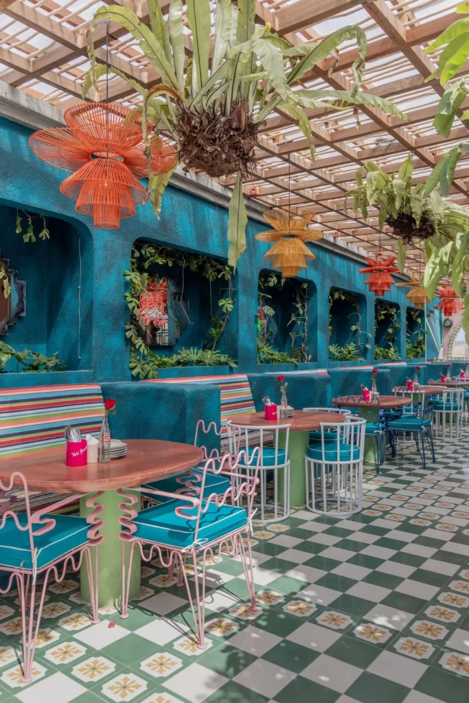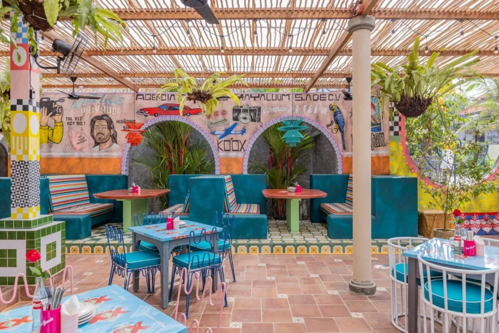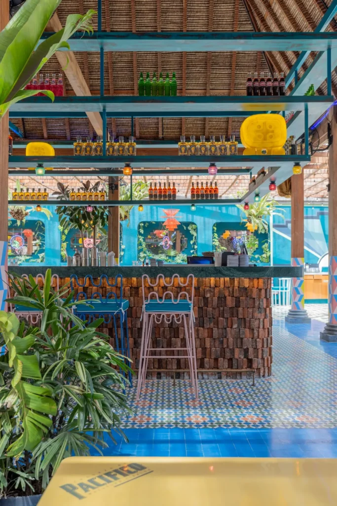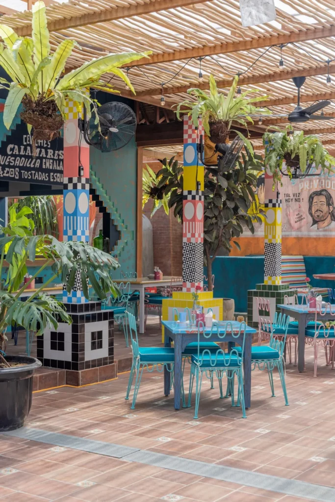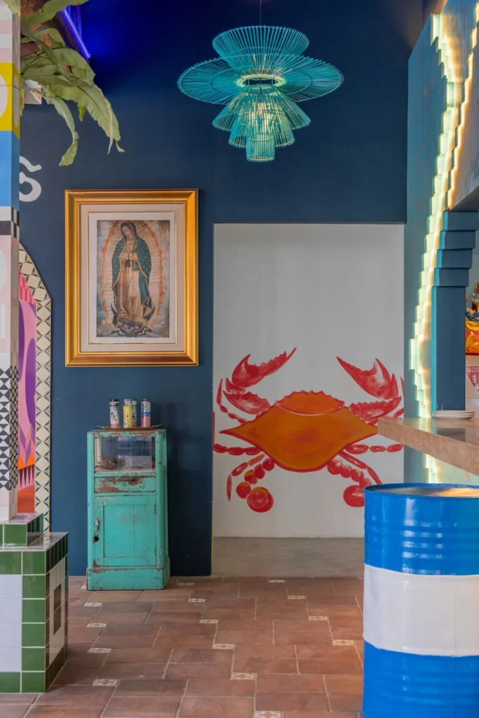Cada rincón del lugar estalla en color, evocando la energía y vitalidad de las calles mexicanas. La combinación de azulejos coloridos, textiles llamativos y una iluminación cuidadosamente pensada genera una atmósfera animada y estimulante.