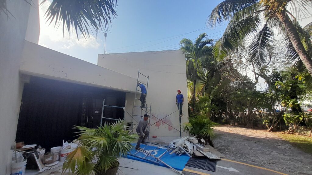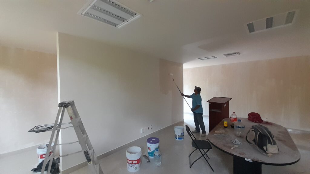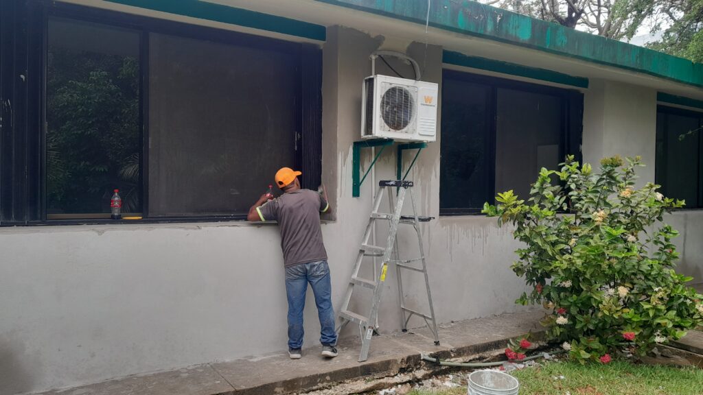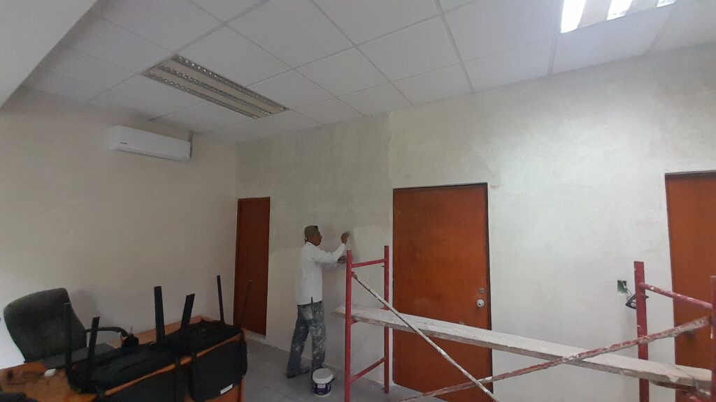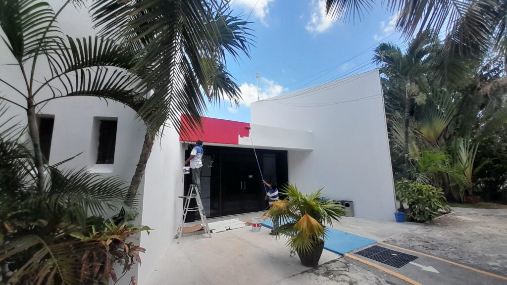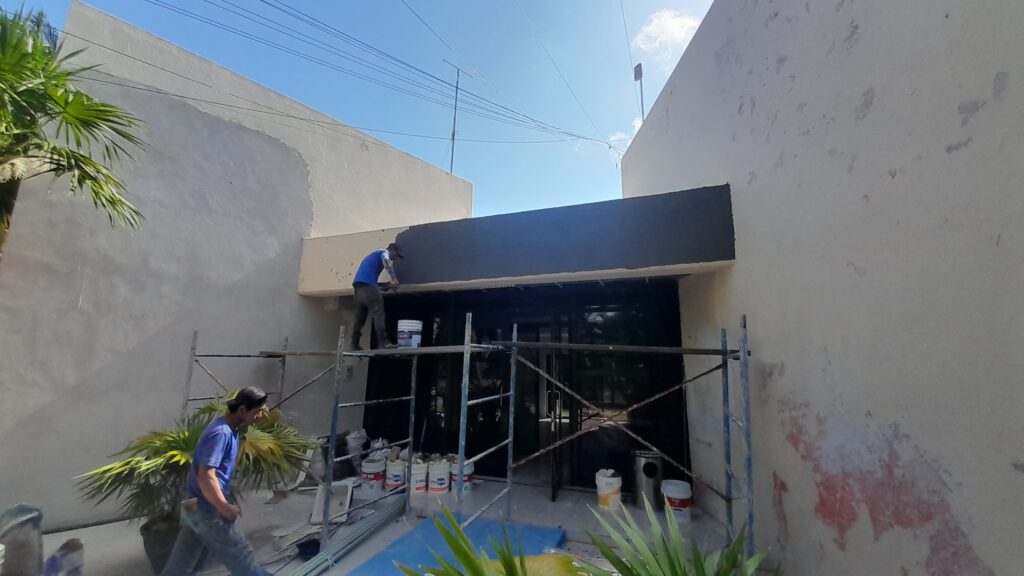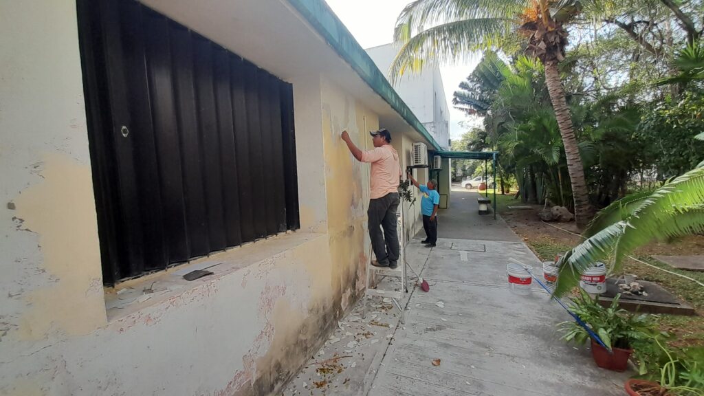 En la fachada, se realizó el retiro de toda la pintura y de los aplanados en mal estado, para la posterior aplicación de masilla, acabado con pintura según los colores institucionales indicados.