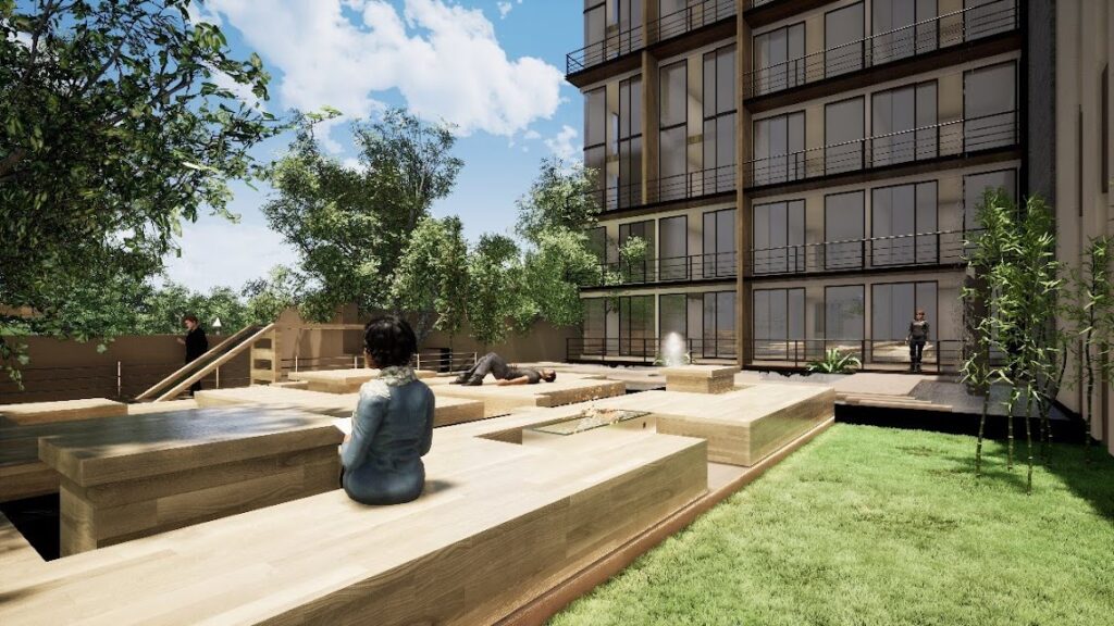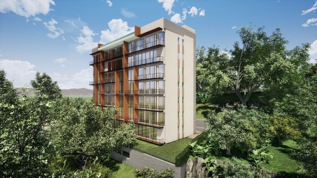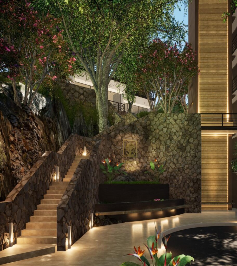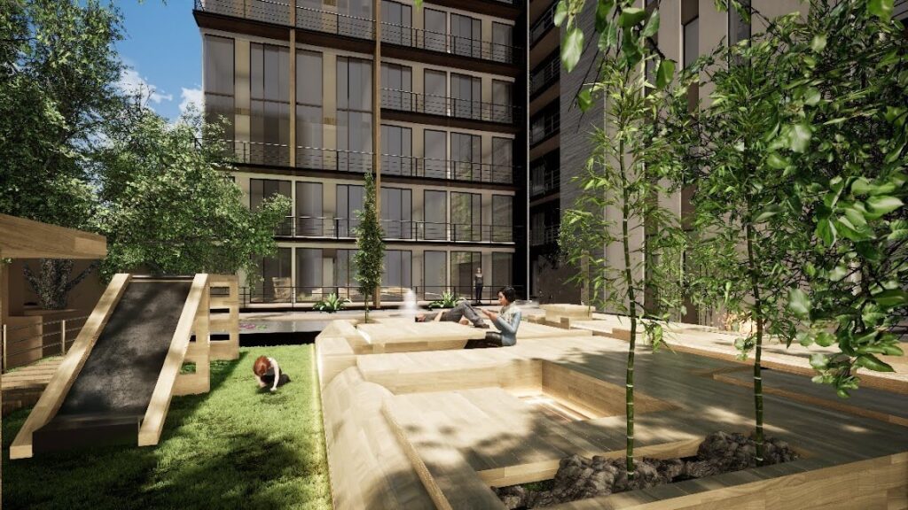 Dos elevadores, vestíbulos amplios, escaleras y corredores de acceso facilitan la movilidad y la convivencia entre los residentes. Más del 50% del terreno se ha destinado a áreas verdes, creando un entorno natural que invita al esparcimiento y al bienestar.