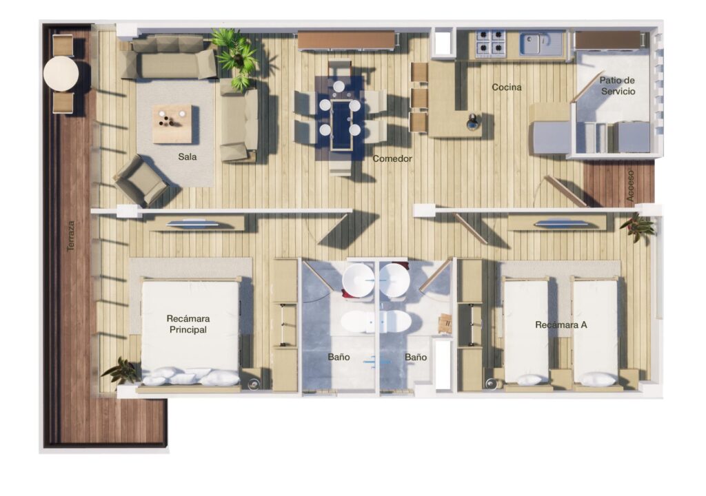 Cada departamento, un refugio de 77 m², se compone de un acceso que da paso a un patio de servicio, una cocina equipada, un comedor y una estancia que se abren a un balcón privado. Dos recámaras, cada una con su propio baño completo, completan este espacio íntimo y acogedor.