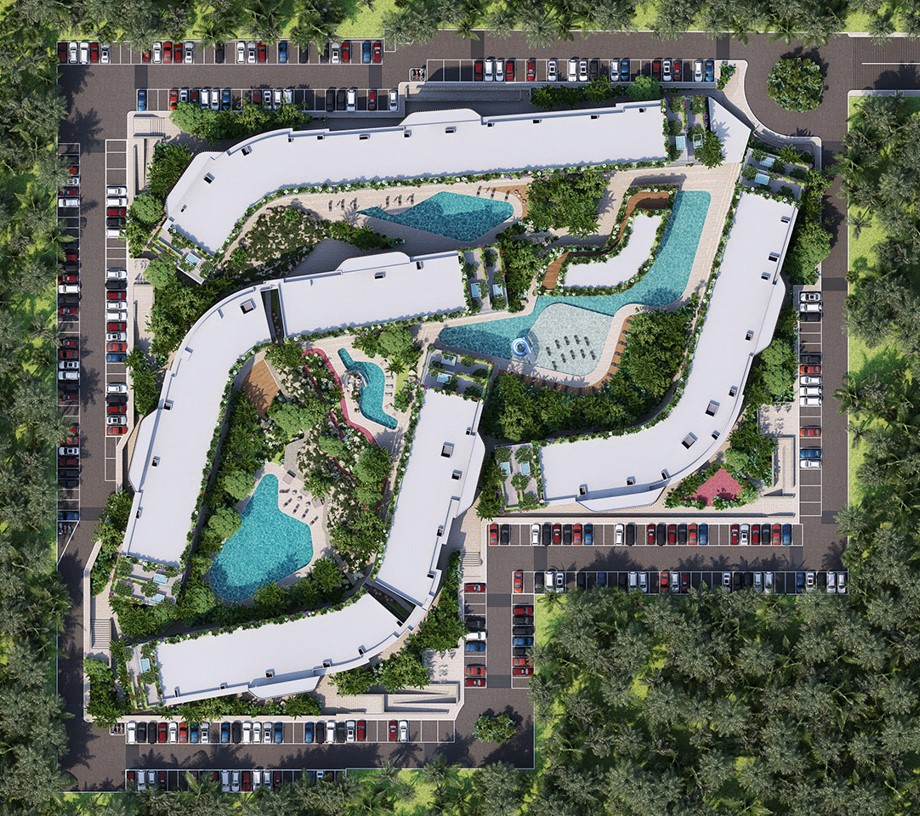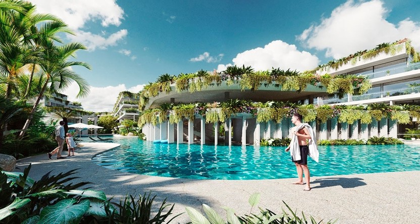 En cuanto a las características generales de la propiedad, se cuenta con tres albercas centrales y una adicional para niños. El acceso al club de playa THE REEF está incluido para los residentes. Las entradas peatonales y vehiculares están controladas para mayor seguridad. Hay áreas específicas para yoga, mascotas, juegos infantiles y relajación, además de asoleaderos y un circuito de jogging.