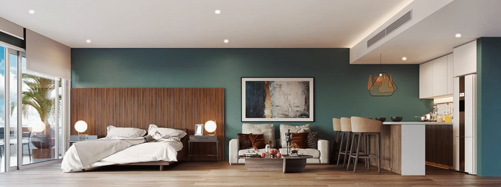 El desarrollo ofrece distintos tipos de unidades residenciales que se adaptan a diversas necesidades de espacio. Las opciones incluyen estudios de 608 pies cuadrados, departamentos de una recámara con 882 pies cuadrados, de dos recámaras con 1,216 pies cuadrados y unidades de tres recámaras con un total de 1,442 pies cuadrados.