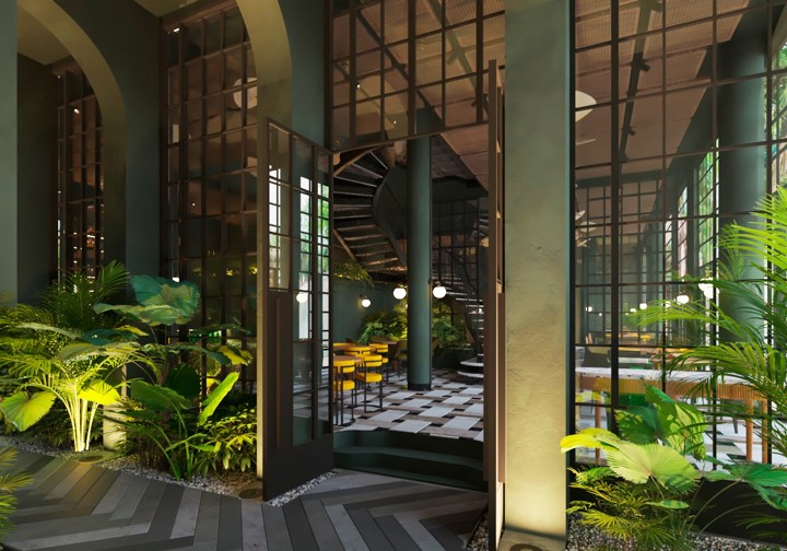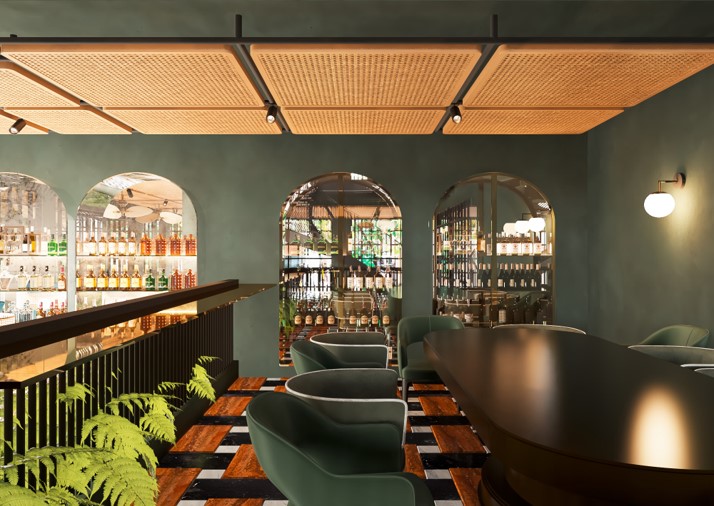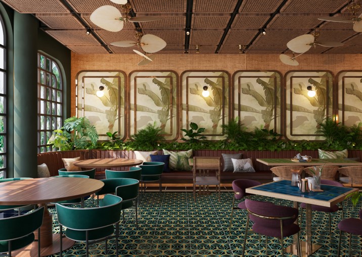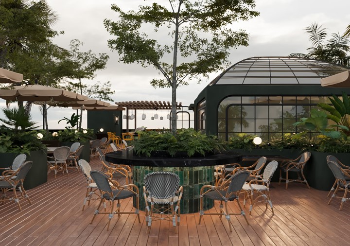 El restaurante presenta una propuesta sofisticada y contemporánea que fusiona la estética del Art Déco con la riqueza natural y la atmósfera bohemia característica de Tulum. El lenguaje de diseño se articula en torno a materiales nobles, geometrías ornamentales y una paleta cromática armoniosa con el entorno.